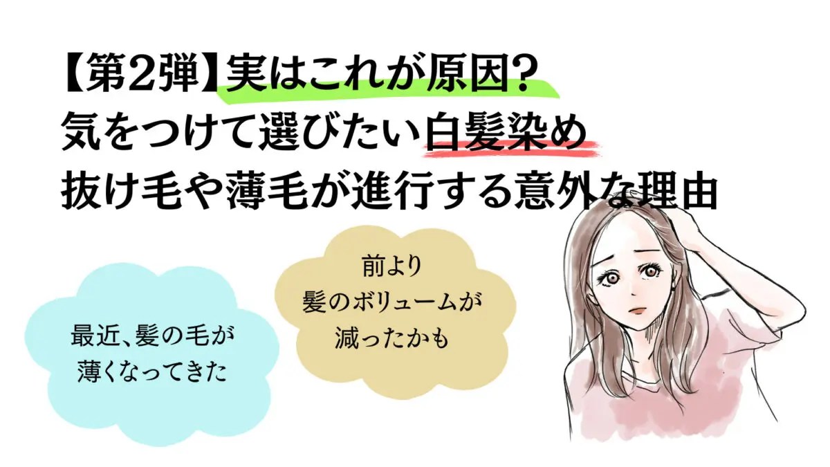 - 薄毛、白髪の原因はヘアカラーだった!? 今すぐヘアカラーをや部るべき理由 白髪を隠したくて染めているなら、逆効果かもしれない?<wellness>(2022/12/17)
